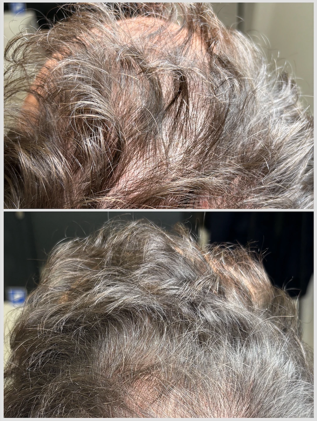 Mężczyzna (45 lat) z widocznym przerzedzeniem włosów na czubku głowy. Wykonano 3 zabiegi preparatem DR. CYJ HAIR FILLER w odstępach 3-4 tygodni. Wprowadzono zmianę w pielęgnacji.