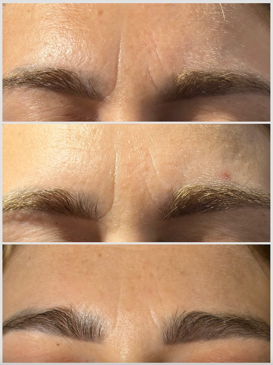 Kobieta (36 lat) z widoczną pionową bruzdą między brwiami, tzw. lwią zmarszczką. Wykonano 3 zabiegi preparatem FILLMED NCTF 135HA w odstępach 4 tygodni, następnie mezoterapię mikroigłową z osoczem bogatopłytkowym. Wprowadzono zmianę w pielęgnacji i suplementacji.